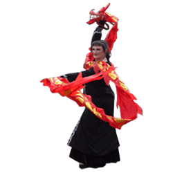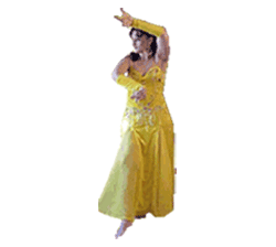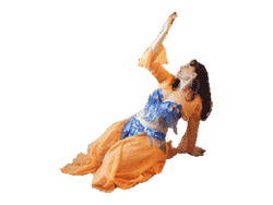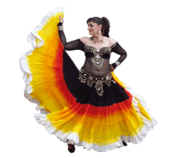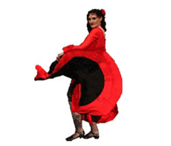 Der Spanisch-Arabische Tanz wird auch Arabischer Flamenco genannt. Er ist ein Mischtanz aus Elementen des spanischen Zigeunertanzes/Rumba und dem orientalischen Tanz. Bedingt ist dieses durch die Völkerwanderung der Zigeuner. Die heutige Form des Arabischen Flamencos ist eine Art Phantasietanz mit Wurzeln in der ziganistischen und spanischen Kultur. Durch Rhythmikklatschen und faszinierende Fußtechnik wird eine Ausdrucksform geschaffen, die feurig und spannungsgeladen ist. Der Arabische Flamenco wird zumeist ohne die "hörbare Fußarbeit" getanzt, die Darstellung des Gefühls und nicht die der Liedgeschichte wird dabei betont. Meist knote ich Fransentücher um die Hüfte. Fächer sind mir ein willkommenes Tanz-Accessoire. |